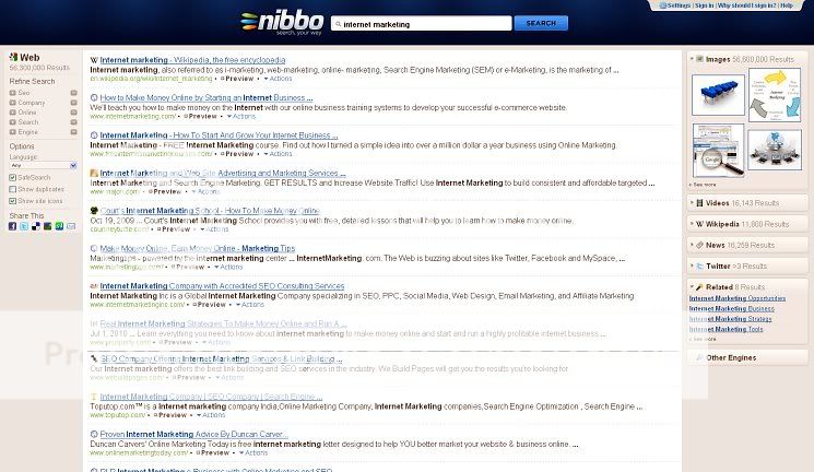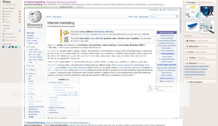 - Main search results front and center. Favicons show up so you can easily spot results from Wikipedia, EzineArticles, HubPages and so on.