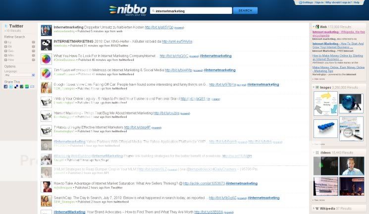 - On the right side you can drill down to specific content types such as video, Wikipedia, Twitter. Click on any of those and bring them up as the main search results. The Twitter one is particularly sweet
