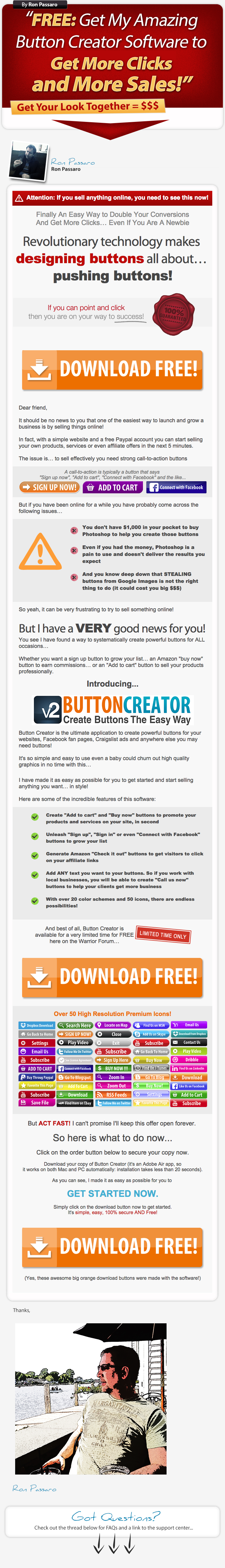 Hi Ron, After following the necessary steps including filling up my e-mail address, there is no further instruction on how to or receiving a download link for your free offer on Button Creator. Please advise. Thank you. |