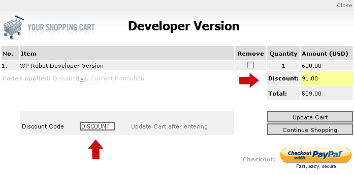 | Get 91 USD discount now! ![]() Hi Warriors, are you looking for valid coupon code for amazing WP Robot? Here are 3 simple steps how to get huge 91 USD discount: STEP #1: buy WP Robot using this special discount link: >>WP Robot special discount link<< STEP #2: click “ADD TO CART” button and use discount code: DISCOUNT ...to get 91 USD discount from regular price of WP Robot Full version or Developer license. Your shopping cart should look like those screenshots: ![]() ![]() STEP #3: click PAYPAL button to complete your purchase. If you don’t have Paypal account you can also pay by your credit card. Full version costs $220 but you will pay only $129 so you get huge 91 USD discount. What are you waiting for? Grab this WP Robot discount coupon and download it right now! ![]() WP Robot 3 is premium WordPress autoposting plugin. If you are looking for powerful autoblogging plugin for your money blogs (with Google Adsense or any affiliate links) I recommend this one. Why is this plugin better than the other ones? Because it consists of a lot of modules (22) such as: