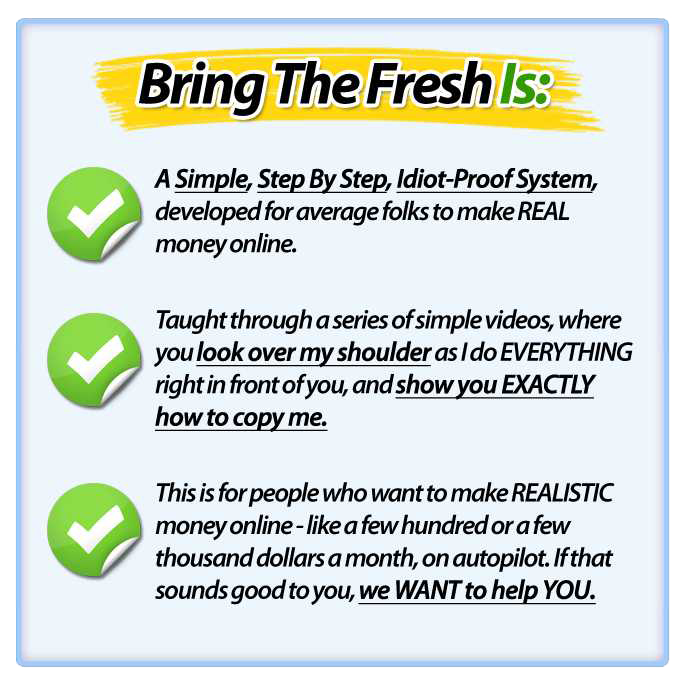 | ![]() Bring the Fresh is basically an affiliate marketing program. I really enjoy affiliate marketing because when you can combined whatever internet marketing method that you want to add to affiliate marketing, more or less it’s going to be passive income and if it’s not passive income now, you can make it passive income. Whether you’re going to decide to pursue a path down Amazon, affiliate marketing or commission junction, Bring the Fresh is honestly the best guide to get you going. If you’re floundering in the idea of affiliate marketing now, this will get you on the right track to pursue it down straight. If you’re already are an affiliate marketer, Bring the Fresh can give you new ideas on how you might be able to scale up as well. When you purchase Bring the Fresh, the first thing you want to get started on is the Fast Start Guide; it pretty much lays out what you have to do, step by step. There’s even a service in the system where they offer to create everything for you; they go out and do keyword research for you, build the blogs and SEO. All you need to do is give them some money and they come back a few weeks later and give you this blog that’s optimized and is already ranking online and getting traffic with a pre-sale post..basically everything there for you to start making money. The Bring the Fresh system will teach you keyword research. You’ll learn how to go and find easy keywords that are easy to rank for and then they’ll teach you how to go and create a blog that’s SEO optimized. Bring the Fresh will teach you how to SEO properly and show you which software and programs to buy your links from because you need backlinks in order to rank effectively. The complete blueprint is handed to you with this system. You’ll learn how to write well converting articles that sell and to get huge amounts of traffic to your site. Everything you need to know to get started and to monetize effectively is all in the system. ![]() We’re all probably techy people here, so the thing that I enjoy the most is that a huge chunk of Bring the Fresh comes in a video training and that’s totally how I learn the best. They also have documents and files too, which are great for referencing back to. Bring the Fresh is definitely an investment for you because this is something that you’re going to make money back with. Whatever money you put in now, you’ll make way more in the near future. If you’re sitting here now thinking this is something I want to get into and focus, it’s really easy, applicable and straight forward that you’ll make the money you invest in it in no time. In terms of support, this is the best system out there. The Bring the Fresh team really answers all your questions and concerns. There is also a forum that is extremely active and helpful for all members; it really is filled with people trying to help each other out, so if you’re serious about your online business join the Bring the Fresh community. |