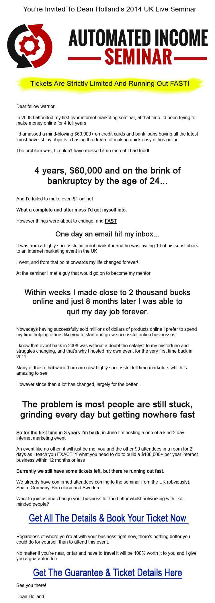 The first seminar I ever attended was Dean and Alex's way back in June 2011. That trip to London changed my life. I had never met Dean or Alex before, and the way they greeted me was like an old friend, as they did everyone who had taken action to go to the event. 4 very short months later I was working with them. So I have a unique perspective of Dean and I can say without doubt that he is one of the most knowledgeable IM'ers on the planet. Not only that, he really gives a damn about the success of his students. I was behind the doors of his business, and the dedication, devotion and determination to those who he mentors was an incredible inspiration to me. I cannot recommend Dean or his services highly enough, and the chance to go and meet the guy in person is one you should not pass up. I know you will blow people away and change lives with this Dean. Congrats on arranging this, we don't have enough of them in the UK. cheers Anthony |